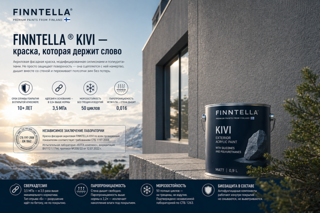 Логика выбора простая: чем жёстче условия эксплуатации, тем важнее модифицированный состав.Умеренный климат, южная экспозиция, защищённый от ветра фасад — базовая акриловая краска с хорошим составом справится.Северная и западная экспозиция, высокая влажность, здания рядом с водой — нужна паропроницаемость выше нормы и биозащита в составе.Климат с резкими перепадами температур, зимние морозы ниже −20°C — морозостойкость 50 циклов, подтверждённая независимыми испытаниями, обязательна.Промышленные здания, склады, производственные объекты — максимальная адгезия и механическая прочность плёнки.Жилые дома, где живут люди — отсутствие токсичных компонентов, водная основа без растворителей.Для сложных условий — сочетания нескольких факторов одновременно — оправдано применение состава, модифицированного и силиконами, и полиуретанами. Такая краска, как FINNTELLA KIVI, сочетает паропроницаемость 0,016 мг/м·ч·Па, адгезию 3,5 МПа (подтверждено протоколом №200/22) и встроенную биозащиту в одной рецептуре — без необходимости добавлять отдельные грунты или пропитки на этапе финишного покрытия.