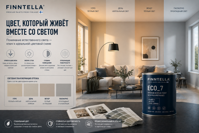 Клиент утвердил цвет по карточке. Маляр закончил. Вы приходите на приёмку и стена выглядит совсем не так. Холоднее. Или, наоборот, пожелтела. Знакомо? Это не ошибка краски и не обман зрения. Это работа естественного света: он меняет воспринимаемый оттенок каждые несколько часов — в зависимости от ориентации окна, времени суток и глубины помещения.Эта статья поможет вам выстраивать цветовые схемы не «на глаз по карточке», а опираясь на световую модель помещения — так, как это делают профессиональные дизайнеры.