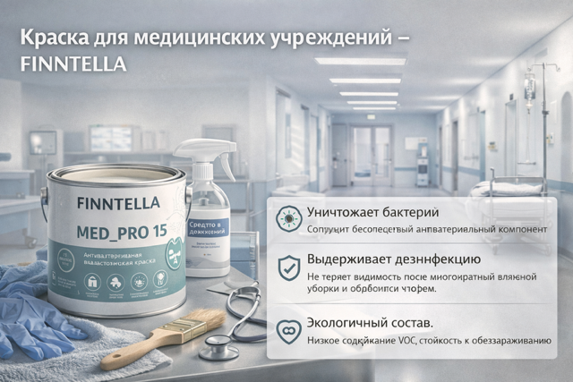 Медицинские учреждения — одна из самых требовательных сред для лакокрасочных покрытий. Стены операционных, процедурных кабинетов, коридоров клиник и лабораторий ежедневно контактируют с дезинфицирующими средствами, подвергаются механическим нагрузкам и должны соответствовать санитарным нормам. Обычная интерьерная краска здесь не справится: она разрушается под воздействием хлорсодержащих растворов и теряет вид уже через несколько месяцев.Краска для медицинских учреждений — это отдельный класс покрытий с особыми характеристиками: устойчивостью к многократной влажной уборке, антибактериальными свойствами и составом, безопасным для пациентов и персонала. Именно такие покрытия предлагает FINNTELLA.